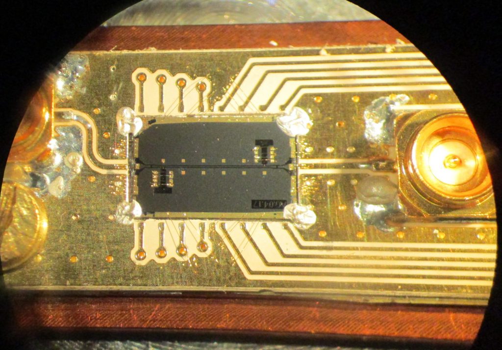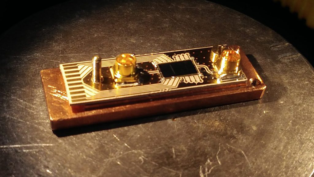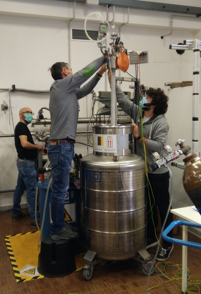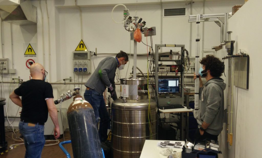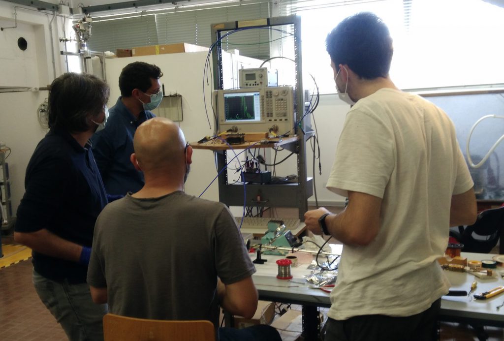Dr. Alberto Ghirri, Dr. Maksut Maksutoglu, Davide Rizzi and Federico Rapuzzi preparing and checking lowT microwave probe.