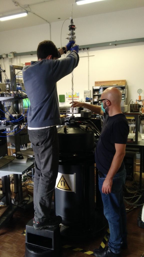Davide Rizzi and Dr. Alberto Ghirri loading lowT microwave probe into PPMS.